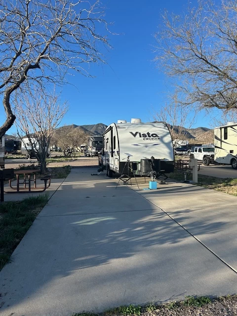 Park Review: 1. Park Quality - The park needs some TLC. Lots of debris, weeds, and goat head thorns everywhere in the park. The laundry room is clean and there are plentiful washers and dryers. I did not use the restrooms or showers. 2. Sites - All sites are concrete pads that are fairly level. Good sized sites with lots of room for outdoor setups. Utilities were good with the exception of extremely hard water. 3. Location - Near Sierra Vista and a short drive to Tombstone. The park is kind of remote and takes about 15 minutes or more to get off Post. 4. Noise - Because of the remoteness of the park it is extremely quiet. 5. Cell Service - Verizon was three bars of 5G. 6. Wifi - Park WiFi was 73 Mbps down and 16 Mbps up. Starlink was 206 Mbps down and 16 Mbps up. 7. Rates - $35 a day. 8. Access - You need to be qualified to access a military installation. 9. Dog Friendliness - I say this place is not dog friendly because of the goat head thorns. They were bad all around the park. There is a dog pen at the park and it’s really pathetic. About a mile away is a really nice dog park that has nice grass and is well cared for. --- Wrapping it up. Many may find this park a good place to spend some time but for me and my dog, we won’t be back.