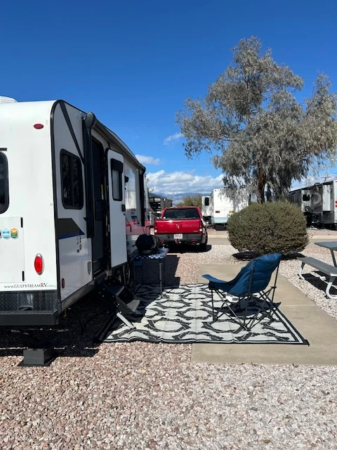 Park Review: 1. Park Quality - This is a very large park that is pretty well maintained. Plenty of washers and dryers and the facility was clean. I did not use the bathroom or shower. With the size of this park, I’m not sure why they don’t accept reservations. 2. Sites - Mostly large white rock that was packed down. There was some slope to many of the sites that could make it difficult to level front to back. Side to side was not an issue. Some sites seemed very close together while others provided plenty of space. Utilities were good with the exception of hard water. 3. Location - Great location near the actual Boneyard and Pima Air Museum. While the golf course was sadly shuttered years ago, in its place is a great walking trail. Highly recommend taking the dog (if you have one) over for a nice long walk. This is also very close to Saguaro National Park, about a 20-minute drive. 4. Noise - Depending on what side of the park you’re on, you might experience road noise from S Wilmont Rd. 5. Cell Service - Verizon was three bars of 5G. 6. Wifi - I didn’t check the park wifi but Starlink was 202 Mbps down and 31 Mbps up. 7. Rates - $35 a day which is fair. They do offer contracts for 3 and 6 months but you must show up to secure one. (still no reservation). 8. Access - You need to be qualified to access a military installation and required RV reservation. 9. Dog Friendliness - For most of the park, my pup didn’t experience any type of thorns. There was some in the surrounding areas but generally nothing in the park itself. There is a really nice dog park at the very back of the northside of the park. There is also a dog wash. -- Wrapping it up. This is a great park with lots of amazing things to do in the local area.