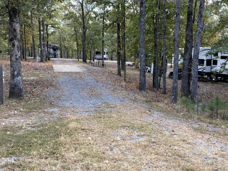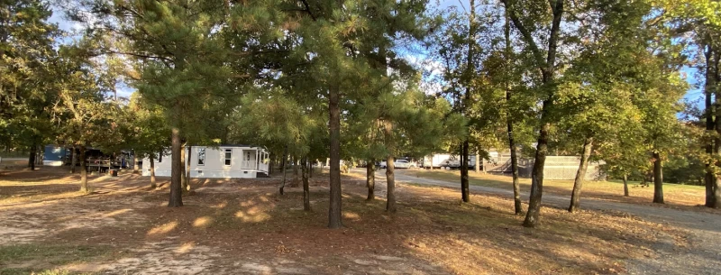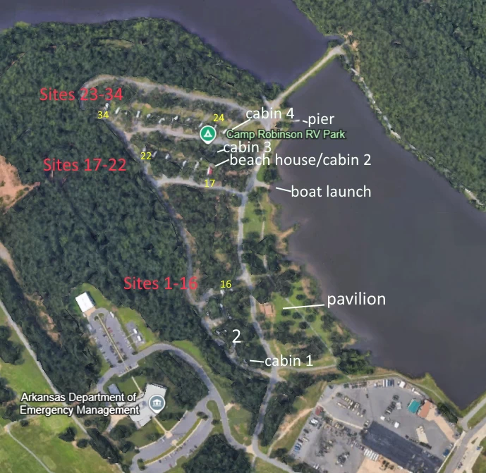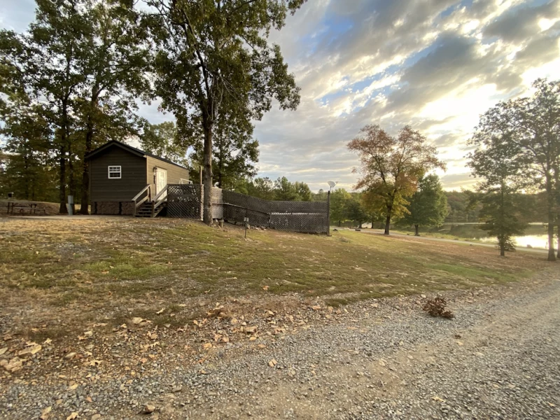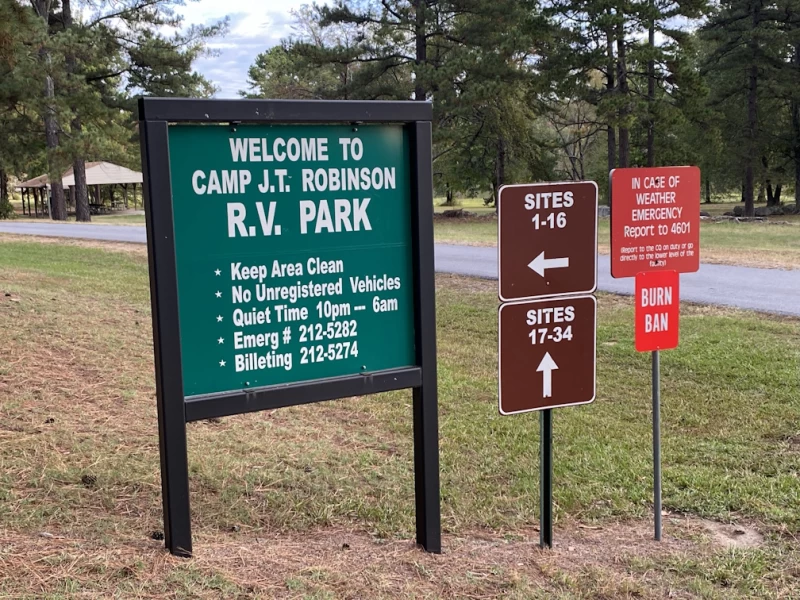 Rustic, but fully shaded RV spots, ensuring comfort and privacy during your stay. FHU, with concrete pad, picnic table and fire ring. Locked electric stanchion with 30/50amp connections, below ground containment with access to septic and water. Suggest using an RV water pressure regulator as supply appears to be very robust. Three loops for the RVs: sites 2-16 back-in, while 18-34 are awesome pull-throughs. Four small cabins at sites 1, 2, 16, 22. Pavilion with grill in front of the RV loops. Boat launch and fishing pier on the shore of the Camp Robinson Lake #2. Small PX. No bathhouse or in-campground common facilities. Roads are either gravel at each site or paved on the outer edges of the loops. Post access through contractor security guards but also have base police force that supports check-in after hours. Post billeting office open 7:30am to 4:30pm. Phone contact is (501) 212-5039. Reservations open at the beginning of the month to allow handling of possible Arkansas National Guard use of the campground training/deployment needs. Must get key for access to electric connections on each RV site. In the fall, much nicer than the MWR camp at Little Rock AFB, but during wet season might be challenging with runoff and flow management. WiFi (Mbps) Starlink 30 down/2 up; T-Mobile 422 down/7 up.