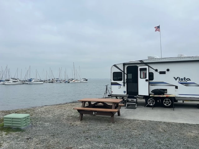 1. Park Quality - Lots of really great things about this park. Clean laundry, ($1.50 for wash and $1.00 for dry) Wide paved road keeps park noise down. Access to water recreation rental fun. 2. Sites - All sites are concrete pads that are fairly level. Utilities were good with the exception of extremely hard water. Sadly, goat head thorns were in abundance. My dog had her paw punctured and it occurred on our pad, not in the gravel or on a trail, I used my leaf blower daily to ensure they didn’t reappear. They were also in the gravel surrounding our site. (One note; there is a wonderful trail out the back side of the park and I found no thorns here.) 3. Location - Its location to Coronado and San Diego make it amazing. But, with the park right on CA-78, NOISE (see next item). 4. Noise - The noise from CA-78 was off the charts. It seemed like every vehicle was racing and all had modified exhausts to increase the noise level. Add in motorcycles and diesel trucks and I promise you peace does not exist. (Yes, I’m old and cantankerous). 5. Cell Service - Verizon was three bars of 5G. 6. Wifi - I do not remember if there was park WiFi as I had no notes on it. Starlink was 220 Mbps down and 35 Mbps up. 7. Rates - $76 a day. 8. Access - The park is not on an installation but there is a gate that requires card key access after normal business hours. (provided by the office at check in). 9. Dog Friendliness - Despite the presence of the goat head thorns, I would say this is very dog friendly. The great trail out the back of the park along, the Bayshore bike path out front and the off-leash park at the entry parking lot, mean there are a lot of places you and your pup can explore. And a short drive up the road is an off-leash dog beach! -- Wrapping it up. This was my final stop in California and of all the military “Famcamps” south of LA this was the best. I would definitely stay here again. (just knowing I need to be more vigilant over the goat head thorns).
