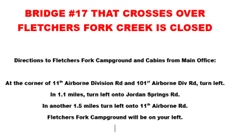 Not what we thought. The Fletcher's Fork while designated for big rigs but very small with no parking spaces for the toad. Cannot find the laundry. The firing from the range, located adjacent to the park, is not a good place for sensitive dogs. The single lane bridge sign says for vehicles not over 9 tons, most large rigs are well over that. Verizon phone gets one bar and web stick does not get a signal. Overall OK but would rather be in a different park.