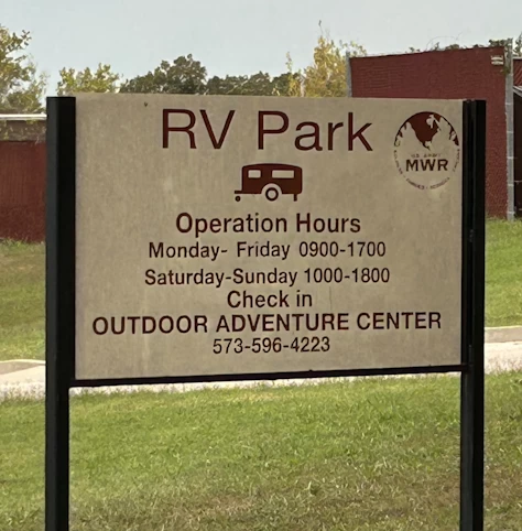 We only stayed for three nights but have no complaints. We had no problem making the reservation and the staff were polite when calling to collect the rest of our site fee. The park had only six or seven RV's while we were there and the utilities worked great. The park is easy to get to from the main gate off Business I-44, continue down Missouri Avenue and take a left onto First Street. The park will be on your left you should not miss it. Would have been nice to have a laundry room but we knew in advance and planned accordingly. The PX and Commissary are close by and a Shoppette is right up from the main gate but did not have diesel. The gym was also close by and not crowded.